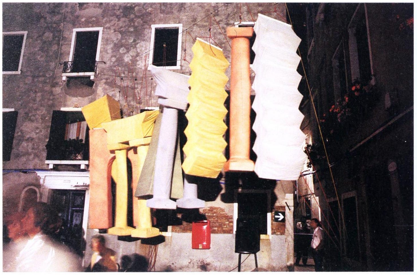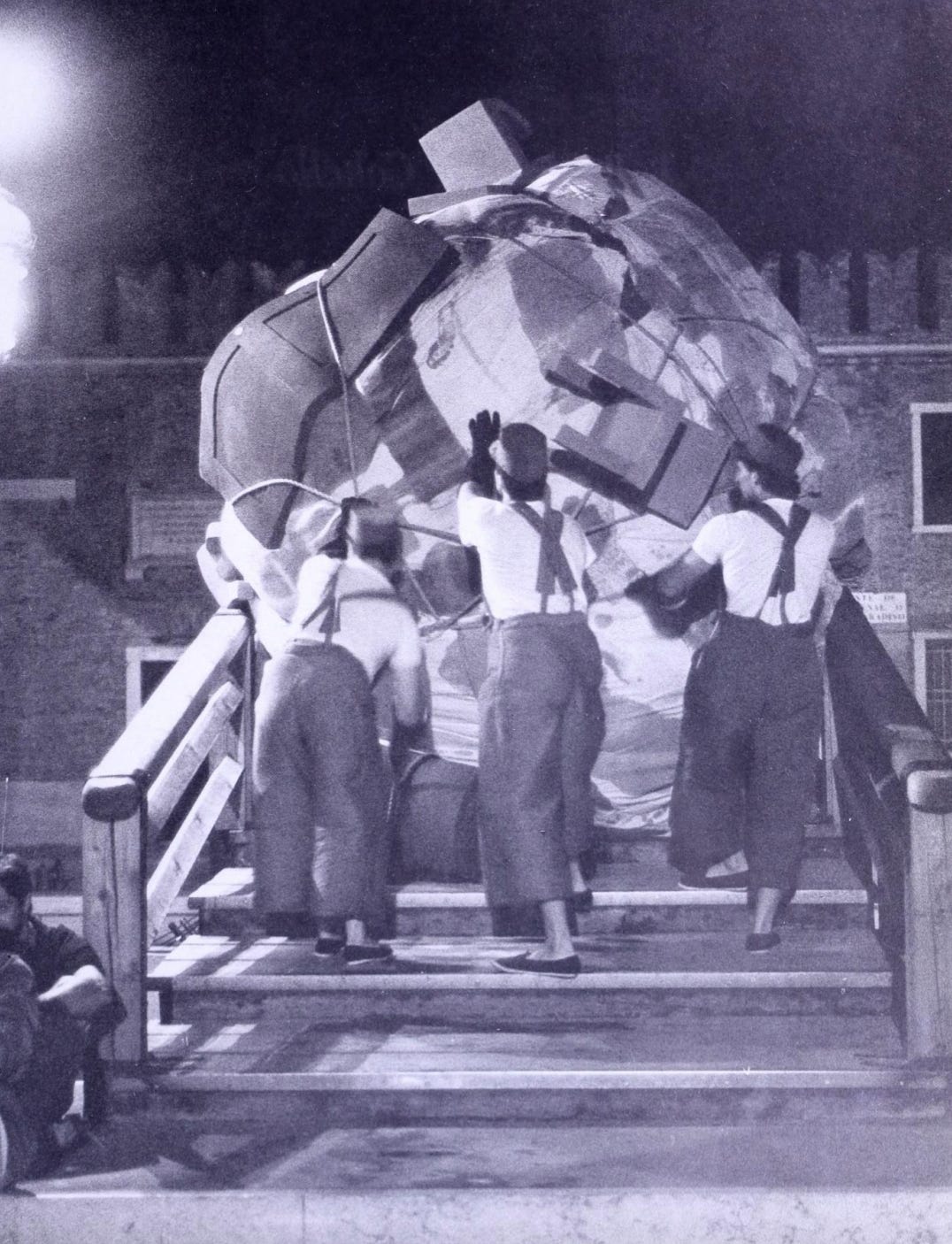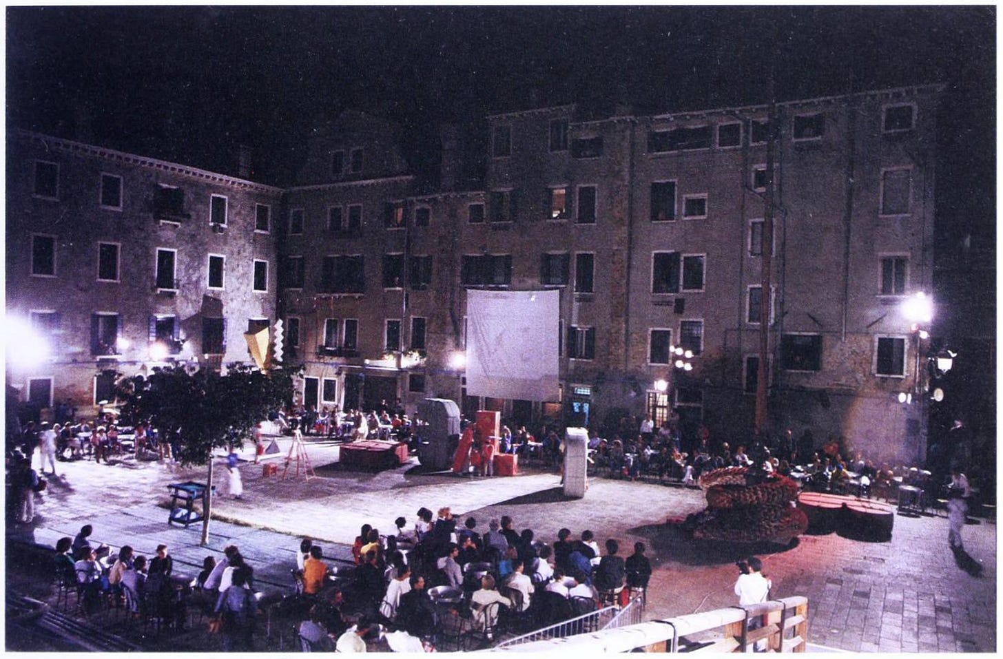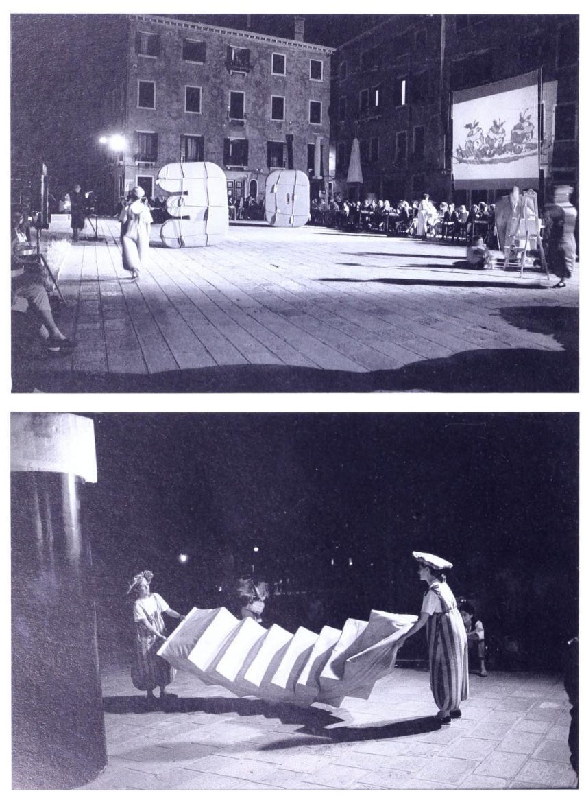 The spectators of the Coltello arrived and were divided into groups of twelve, guided along the Fondamenta by waiters in black costumes with oversized white bow ties. In the open space of the campo they faced a “café”: tables and chairs waiting as if the performance had already begun without them. Seated in groups of six, they were served coloured water, poured into hollowed surfaces built into the tables. Porters in grey rolled oversized letters of the alphabet across a bridge. As Oldenburg treated sound as another object, he had a taped score of voices and noise run against a violinist playing the kind of classical pieces tourists expect to hear in Venice. All this while myriad of other characters moved about, reciting their lines.