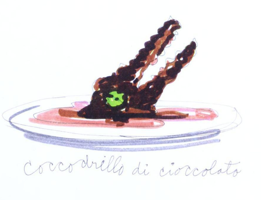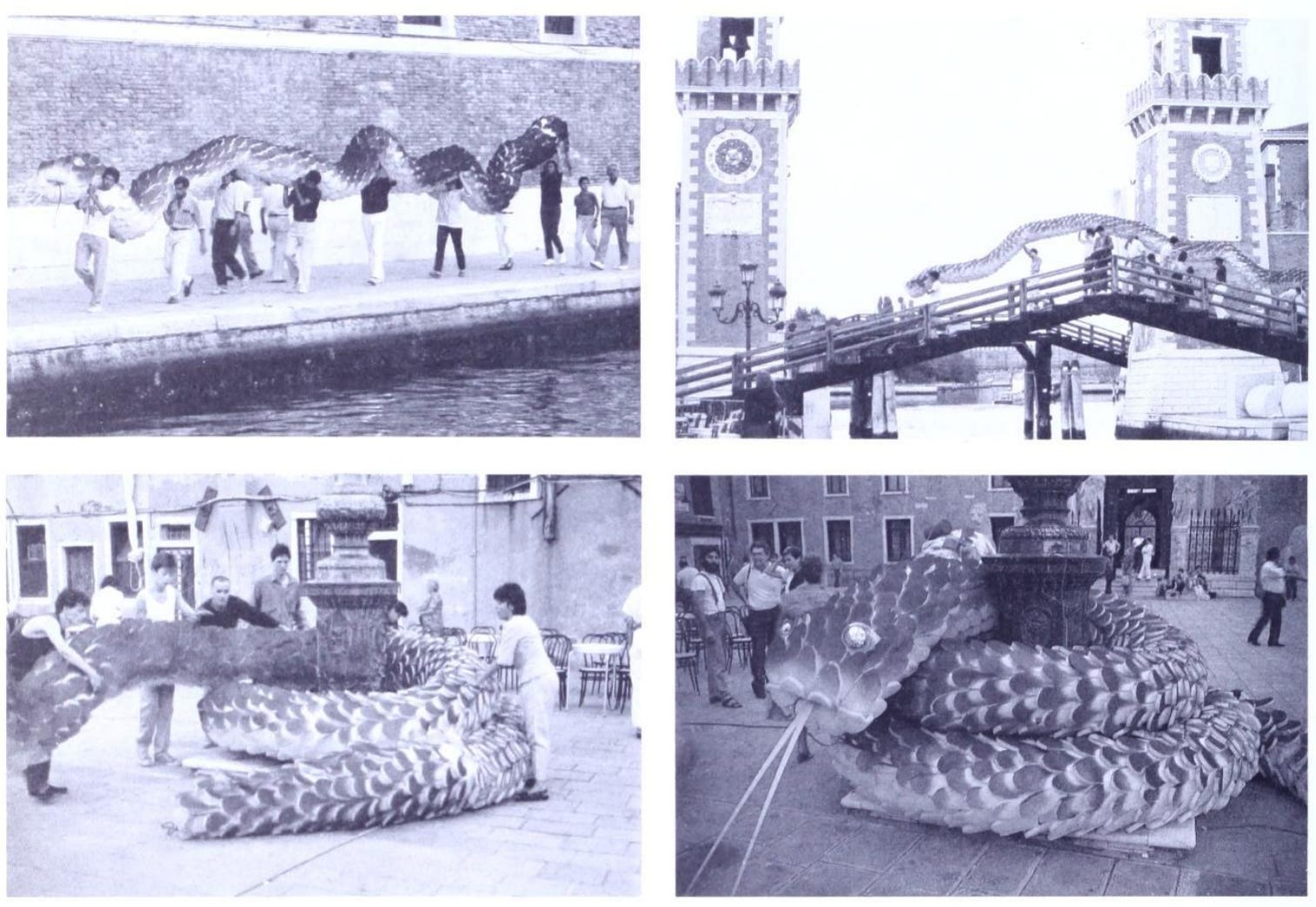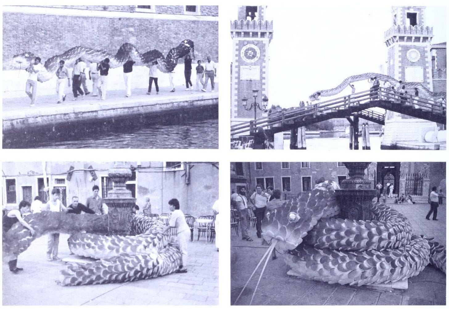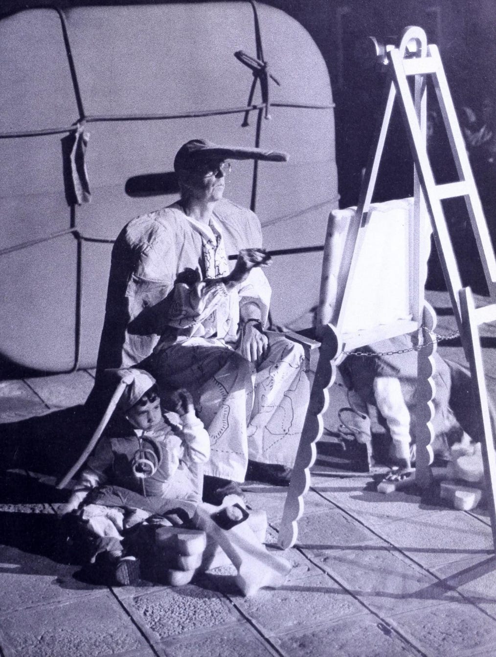 The spectators of the Coltello arrived and were divided into groups of twelve, guided along the Fondamenta by waiters in black costumes with oversized white bow ties. In the open space of the campo they faced a “café”: tables and chairs waiting as if the performance had already begun without them. Seated in groups of six, they were served coloured water, poured into hollowed surfaces built into the tables. Porters in grey rolled oversized letters of the alphabet across a bridge. As Oldenburg treated sound as another object, he had a taped score of voices and noise run against a violinist playing the kind of classical pieces tourists expect to hear in Venice. All this while myriad of other characters moved about, reciting their lines.