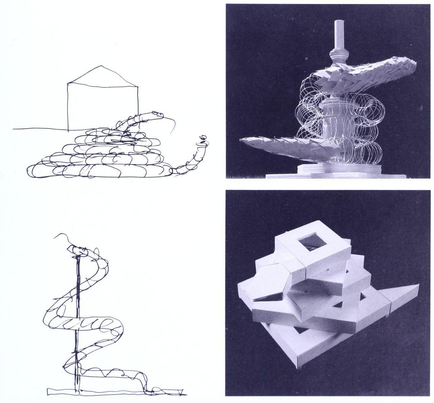 At the outset, van Bruggen and Oldenburg spent two weeks in Gehry’s Venice office, following his daily routine and absorbing his working method. What clicked was a shared instinct: architecture shouldn’t behave like a neutral container. A building could be an object, something to register immediately, before being able to understand what it’s for. Oldenburg had been doing this for years by enlarging ordinary things until they became architectural in scale and impossible to ignore. Gehry, from another direction, was pushing buildings toward a more bodily, sculptural presence, towards forms that hit you first through sensation, not explanation. For all three, the starting point wasn’t clarity but disruption: take the familiar, knock it off balance, and let new meaning form in the wobble.